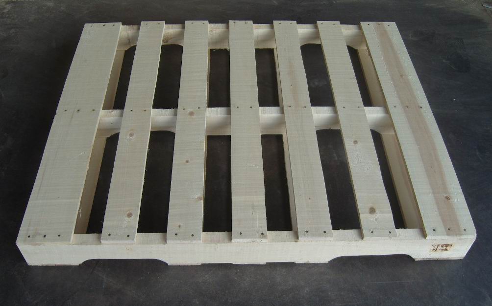 木托盤以原木為材料,進(jìn)行干燥定型處理,減少水分,消除內(nèi)應(yīng)力,然后進(jìn)行切割、刨光、斷頭、抽邊、砂光等精整加工處理而形成型材板塊,采用具有防脫功能的射釘(個別情況采用螺母結(jié)構(gòu))將型材板塊裝訂成半成品托盤,最后進(jìn)行精整、防滑處理和封蠟處理。木托盤是現(xiàn)在使用最廣的托盤。托盤是用于集裝、堆放、搬運和運輸?shù)姆胖米鳛閱卧?fù)荷的貨物和制品的水平平臺裝置。一般用木材、金屬、纖維板制作,便于裝卸、搬運單元物資和小數(shù)量的物資。是現(xiàn)在使用最廣的,因為其價格便宜、結(jié)實。